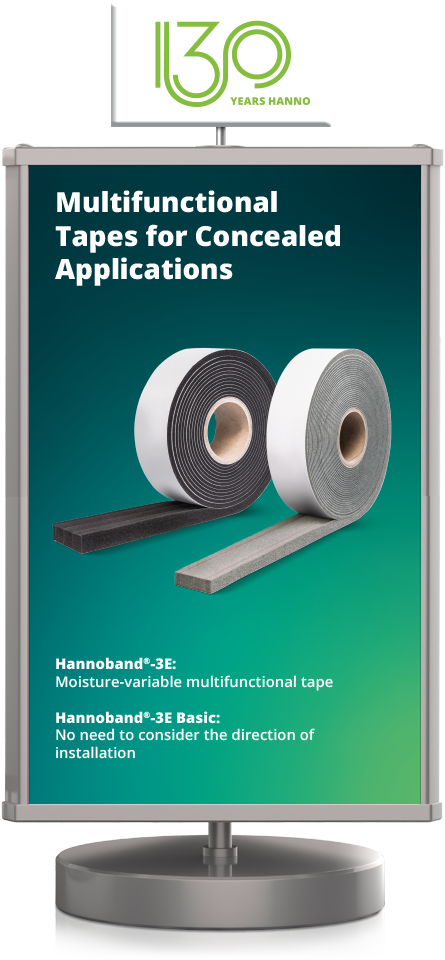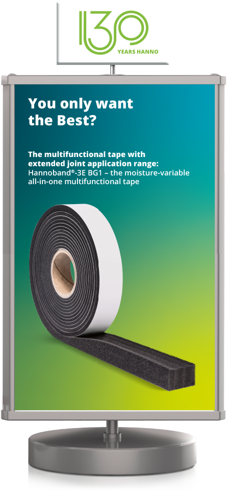 Hannoband®-3E Basic BG1 – for sealing all functional areas in window joint sealing. The tape fulfills all requirements including airtightness and heavy rain tight sealing. The different tape widths and thicknesses enable a great variety of joint widths and window profile dimensions to be sealed.