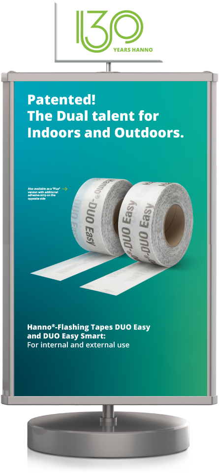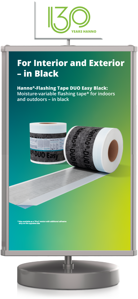Hanno®-Flashing Tape DUO Easy was designed especially for curtain-type window elements often used for energy efficient constructions. It is moisture-variable and therefore can be used both inside and outside. The sd value for both tapes is between 0.48 ≤ sd ≤ 12 m.