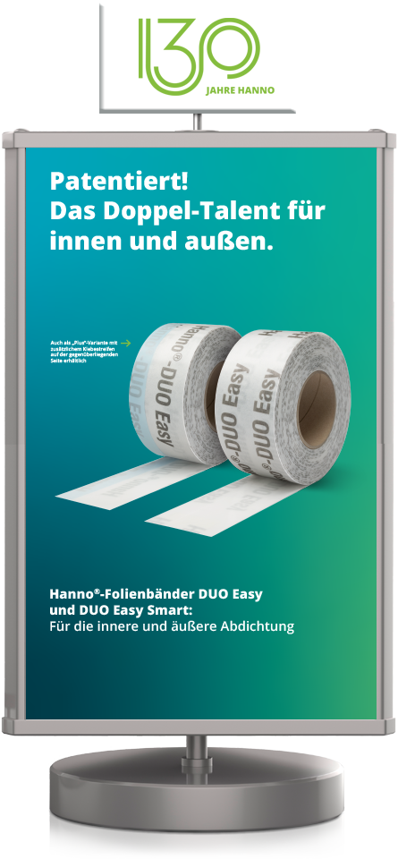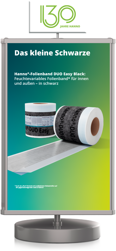 Hanno®-Folienband DUO Easy ist vor allem für vorgehängte Fensterelemente, wie man sie oft in der Niedrigenergiebauweise antrifft, konzipiert worden. Es ist feuchtevariabel und daher sowohl innen als auch außen einsetzbar. Der sd-Wert für beide Bänder liegt dabei zwischen 0,48 ≤ sd ≤ 12 m.